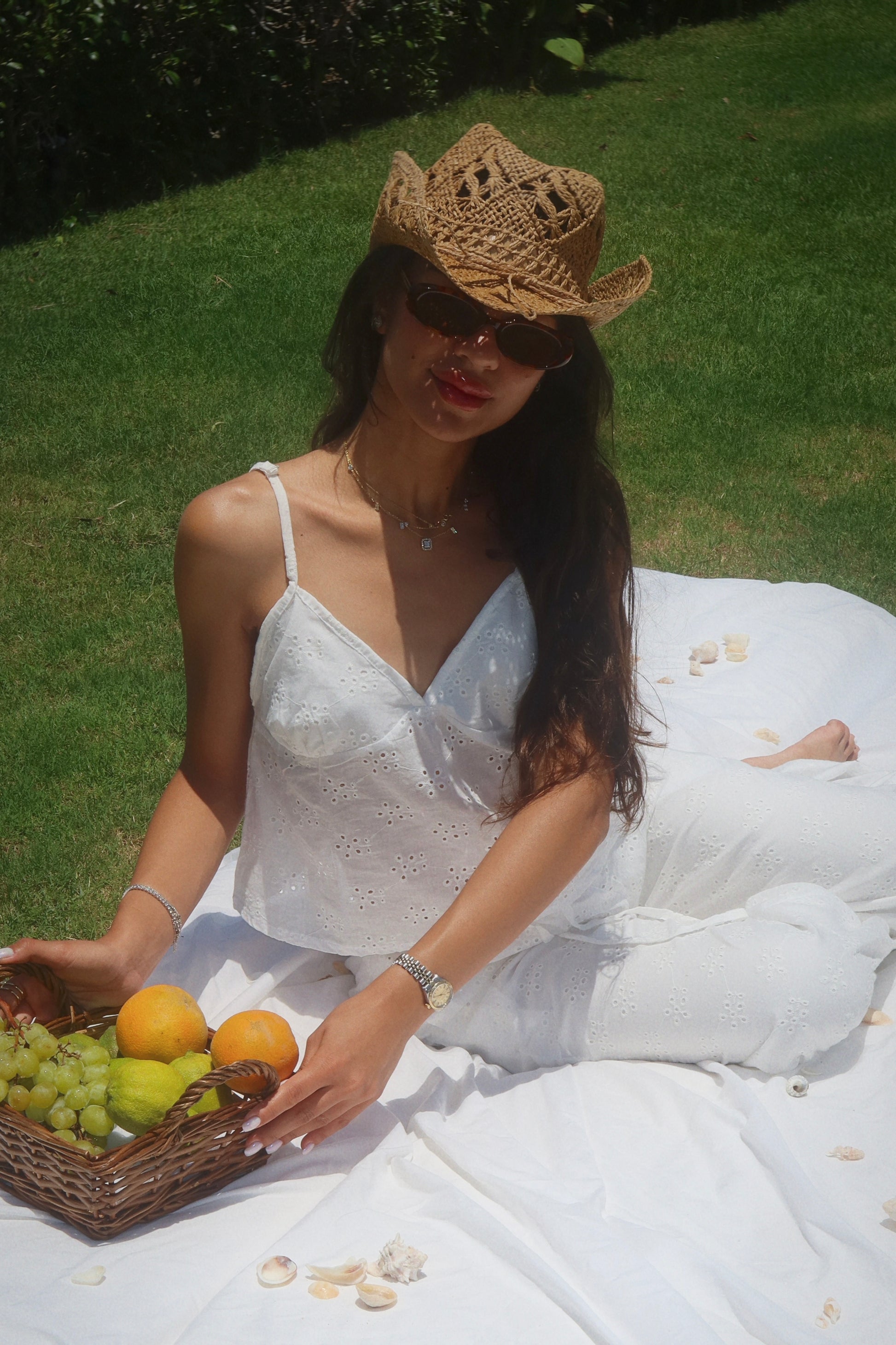 Made in a breathable embroidered cotton with delicate eyelet details, it features an easy drawstring pant and a flattering cami top with adjustable straps. Wear it in, wear it out — it’s made to move with you.